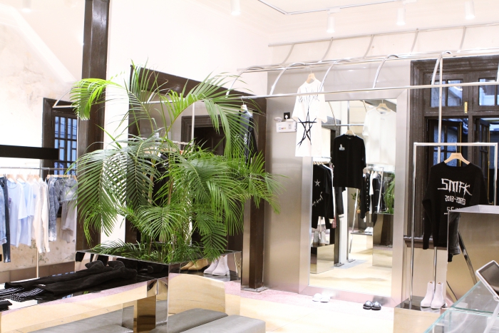 这里主要出售国内设计师潮牌SMFK的单品,包括SMFK x R!CH(中国新说唱)联名系列,只有一小部分区域展示日本潮牌的单品。