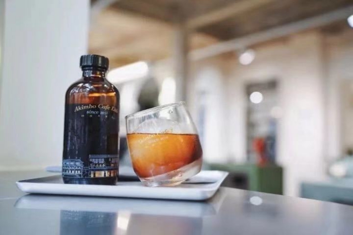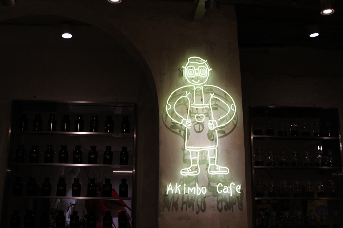 推开一扇银色铁门,首先映入眼帘的是一个开放式的咖啡店——“Akimbo Cafe Lab(艾肯博咖啡实验室)”。两年前,以设计师出身的创始人在深圳开了第一家Akimbo咖啡店,主打手冲咖啡。“Akimbo”在英语里是双手叉腰的意思,所以咖啡店的logo是一个双手叉腰的小男生,据说是以创始人为原型设计的。