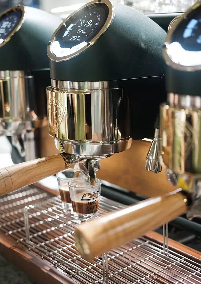 绿金配色的咖啡机是三头定制版SANREMO Cafe Racer咖啡机,目前上海只有三台,店员说咖啡机是以机车为设计灵感,还蛮酷炫的。