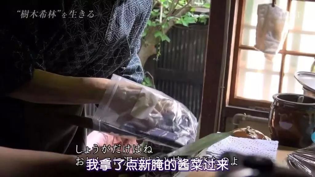 在《活出“树木希林”》中,有一场拍摄《有熊谷守一在的地方》的桥段,为了接近人物,她把用了四年的菜刀带去片场替换道具菜刀,用自己家里的旧手帕代替道具抹布,还有自己刚刚腌制的酱菜,她说自己这样用着惯,在厨房舞刀时,将自己的生活真实地带进了电影里面。