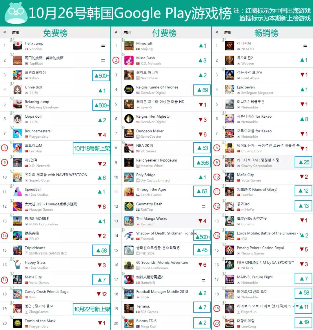 付费榜方面本期共有8个游戏新榜,排名第4的《王权 权力的游戏》也成功从海外攻入韩国市场了。至于中国出海游戏则是有心动网络的《Muse Dash》高居榜眼。