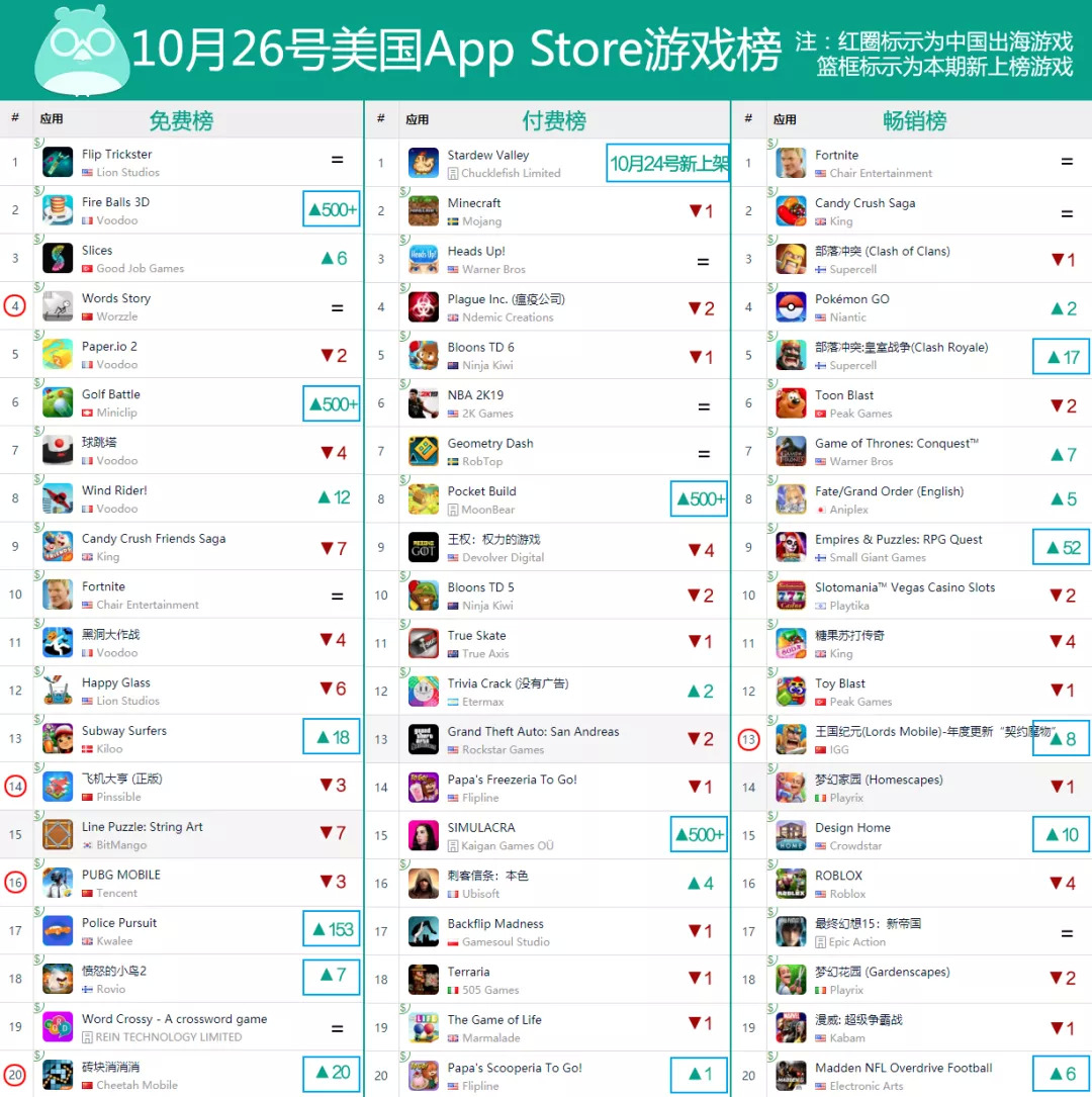 先来看看免费榜的情况,本期美国市场免费榜共有6款新上榜游戏,其中排名上升了20位之后排在第20的《砖块消消消》是来自中国厂商出海游戏。此外,《Words Story》、《飞机大亨》和《PUBG MOBLIE》3款前辈也未跌出前20。
