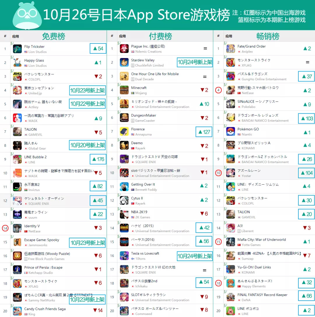 再来看看本期的日本市场:这仍然是变化最大的市场,而且新上市游戏也经常能在这里打出足够抢眼的表现。