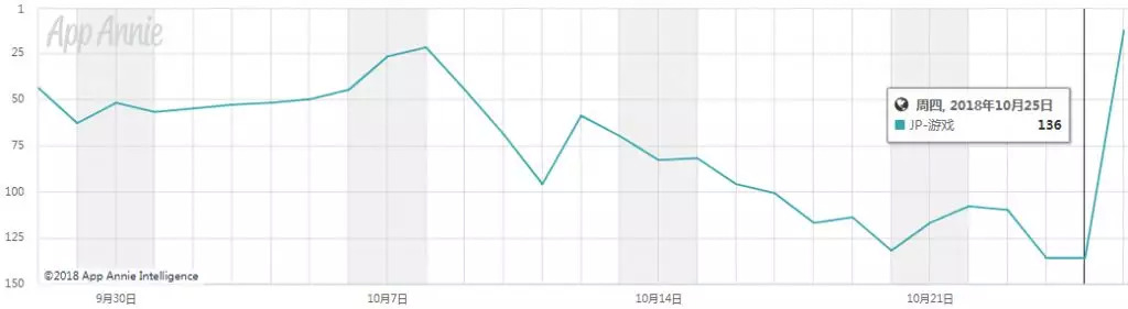 《碧蓝航线》在日本App Store游戏畅销榜的排名25号还在136位,但是26号却冲上了Top20!