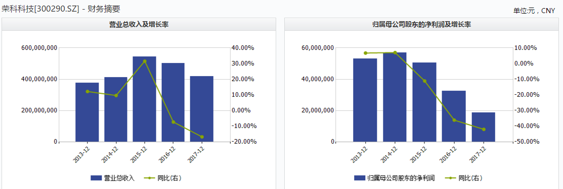 近几年来,荣科科技的业绩呈现出明显的下滑态势。2015年、2016年、2017年公司营收直线下滑,分别为5.42亿元、5.03亿元、4.19亿元,直至2018年上半年才有小幅回升,而净利增速自2015年便直线下滑且降幅逐年扩大,分别为11.08%、36.02%、41.91%。2018年10月26日,荣科科技披露的三季报中,公司实现营收3.71亿元,较上年同期增长46%,归母净利润886.24万元,较上年同期减少23.81%,而扣非净利润为0元,同比下降100.05%。