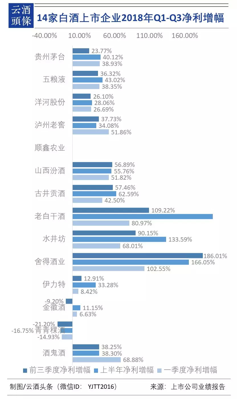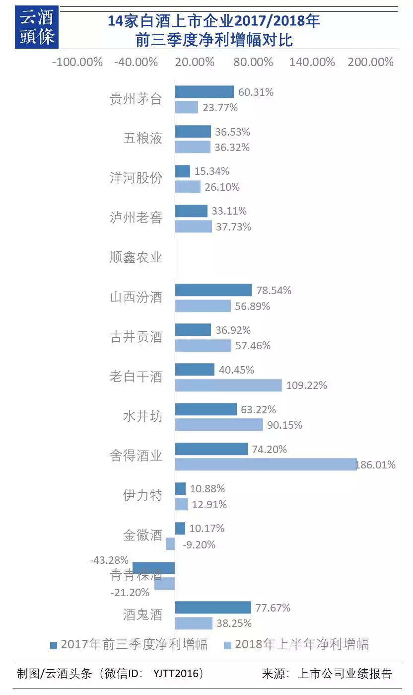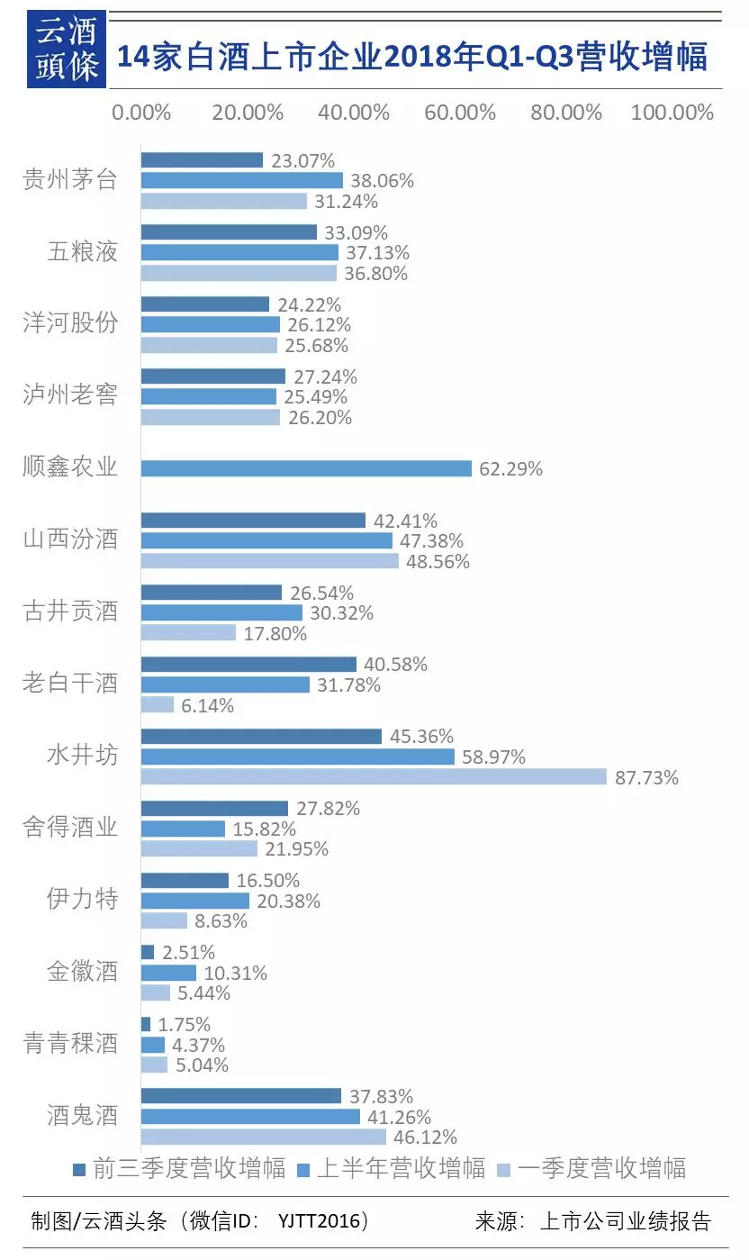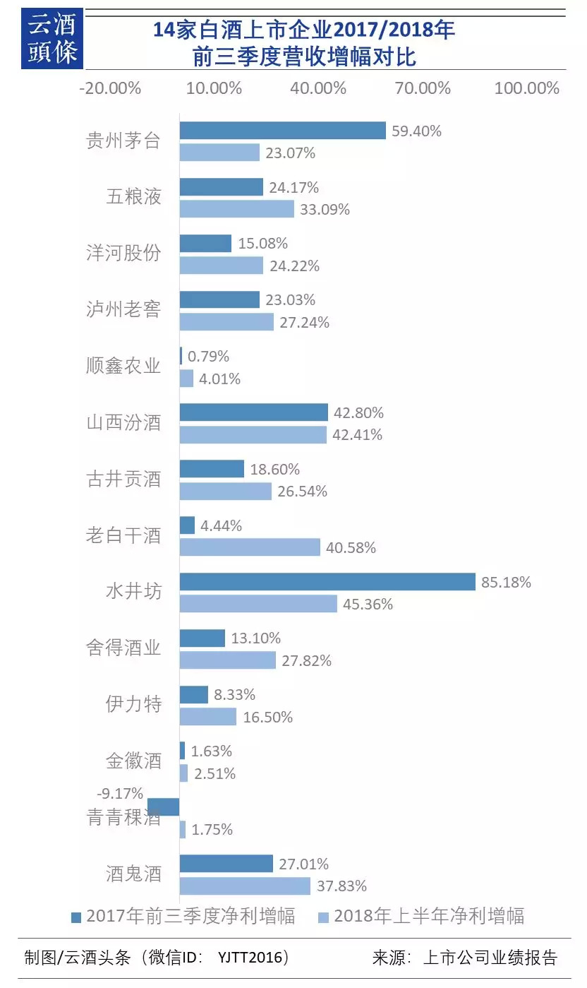 与此同时,五粮液、泸州老窖2018年前三季度分别完成了去年全年业绩的97%和89%,而洋河、汾酒2018年前三季度业绩已全面赶超去年全年。