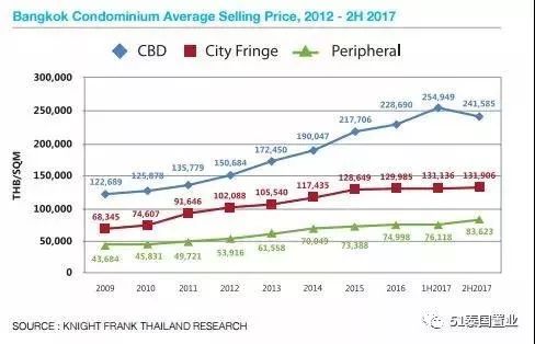 看上面莱坊(Knight Frank)的房价走势图就知道了,Bangna-Bearing以及再往南都属于Peripheral(外围区),这片区域2015年的均价是7.3万泰铢左右,2017年下半年为8.3万左右。而莱坊最新数据显示,2018年上半年Peripheral(外围区)的房价约10万泰铢左右。