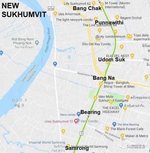 它原是素坤逸线最后一站,现在素坤逸线再往南延伸9站,Bearing更像是连接曼谷与外府的中间站。打开谷歌地图,可以看见,该站附近,该有的都有了,国际学校、购物中心、医院、高尔夫球场、餐厅等;开车十几分钟便可到达“曼谷城市绿肺”Bang Krachao公园。而这些也构成了曼谷市区之外的都市生活圈,居住价值进一步提升。