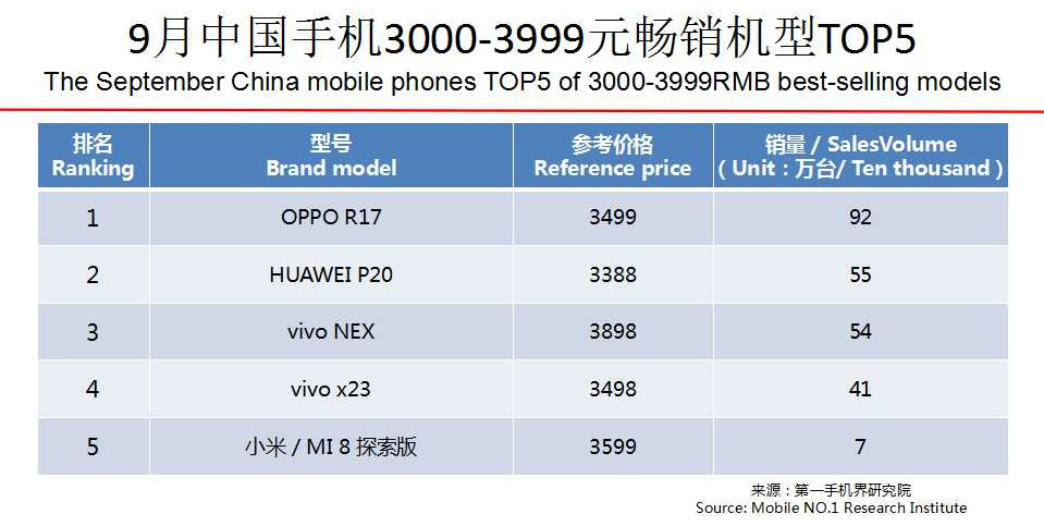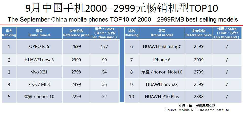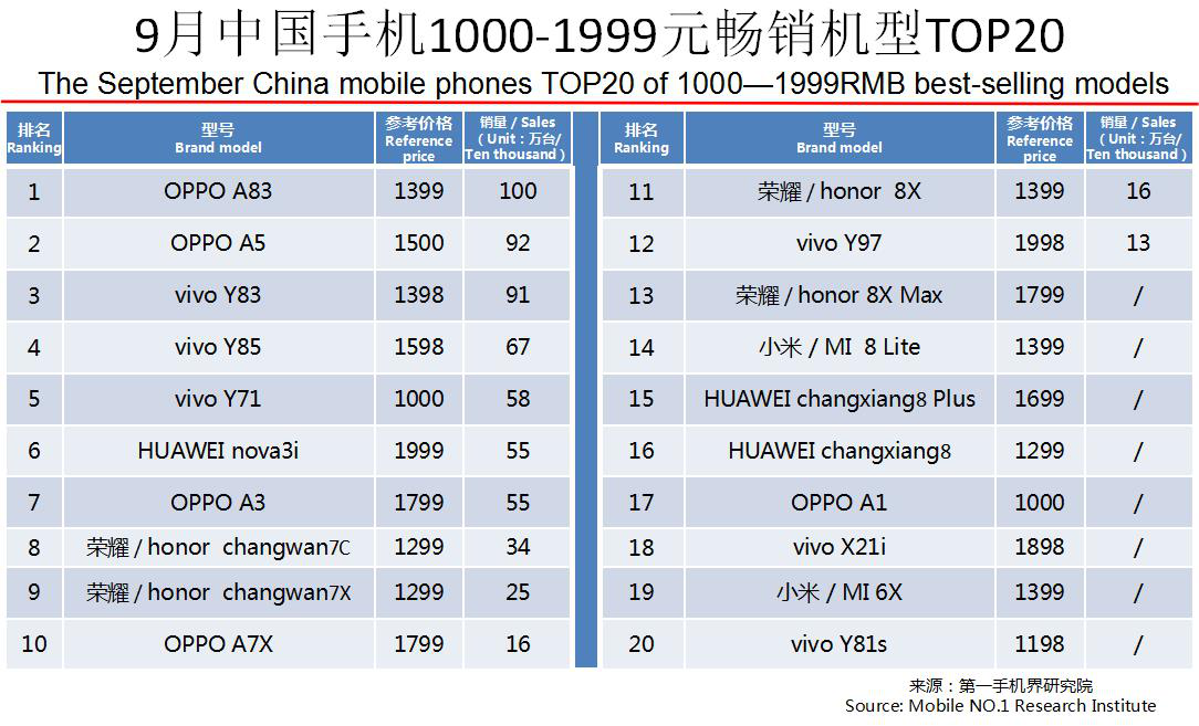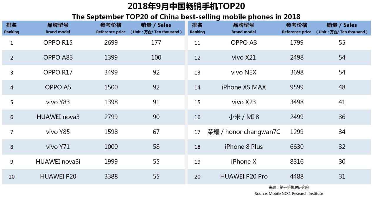 OPPO R15、OPPO A83、OPPO R17、OPPO A5、vivo Y83、华为 nova3、vivo Y85、vivo Y71、华为 nova3i、华为 P20成为9月中国畅销手机TOP 10。