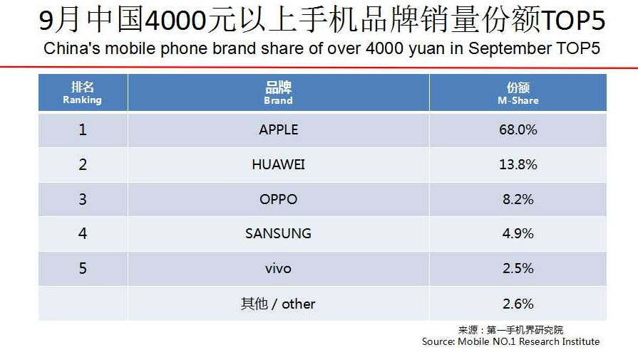 9月中国手机4000元+畅销机型TOP11中,苹果新机iPhone XS Max尽管拿下冠军,但并不如苹果新机往年发售的首月表现成绩。48万台这个数字,甚至不及今年6月iPhone X在销售热度已然冷却情况下的65万台月销量。