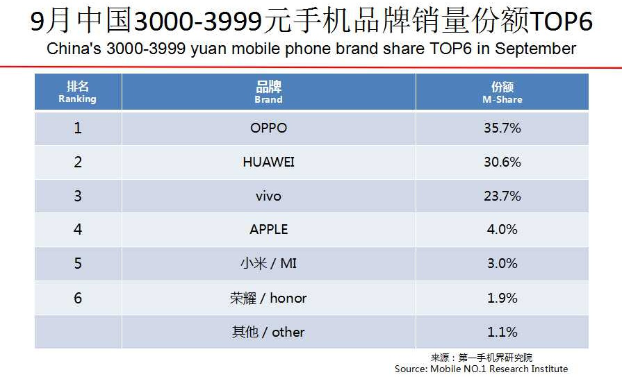 值得注意的是,9月中国3000-3999元手机品牌销量份额前四强全换位。其中,OPPO凭借OPPO R17的热销成功登顶,并将华为在该区间的市场份额压缩至30.6%。