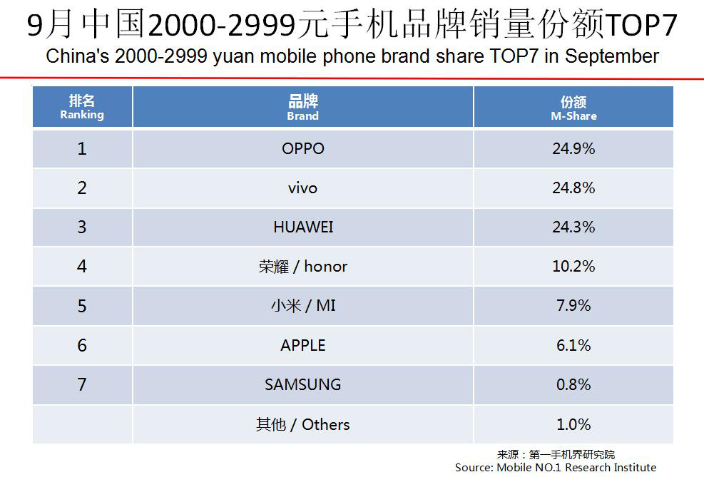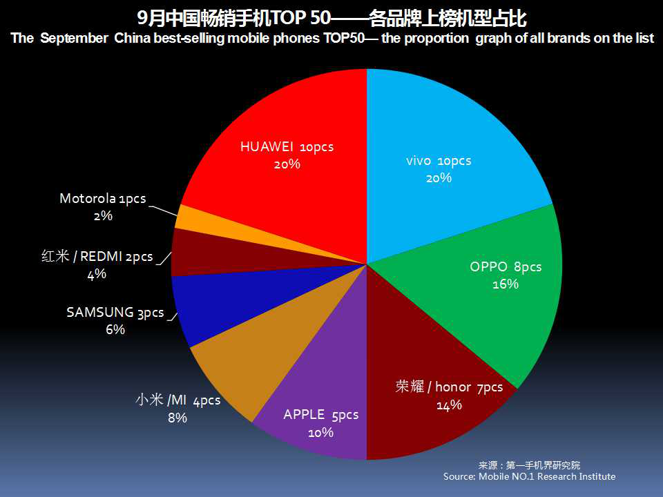 OPPO、vivo、华为、荣耀、小米、苹果、中国移动、魅族、三星、康佳成为9月中国手机品牌销量TOP 10。