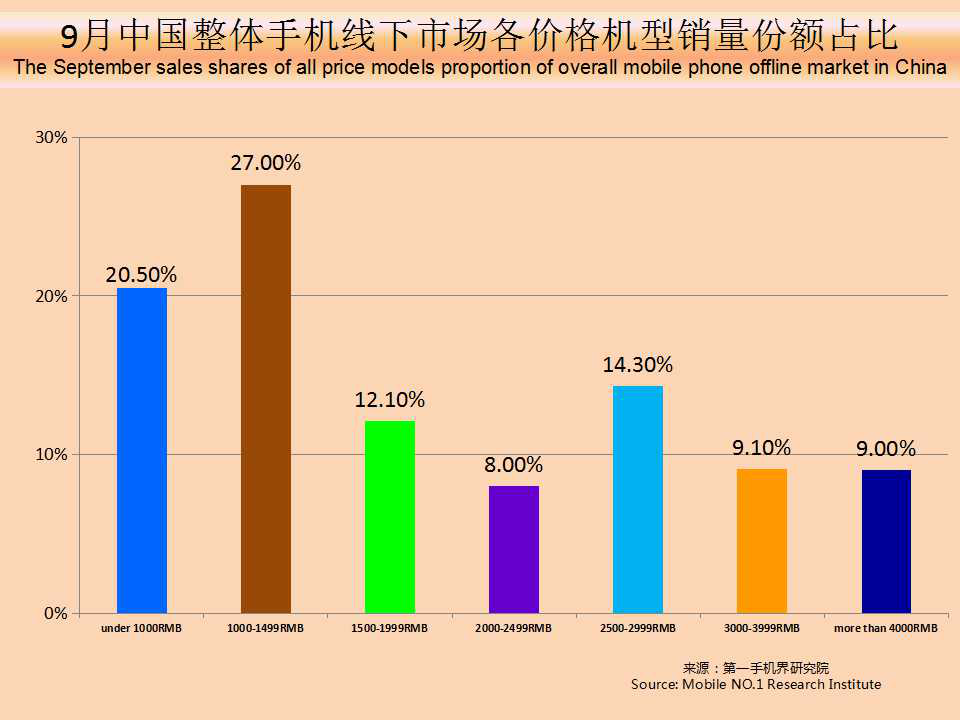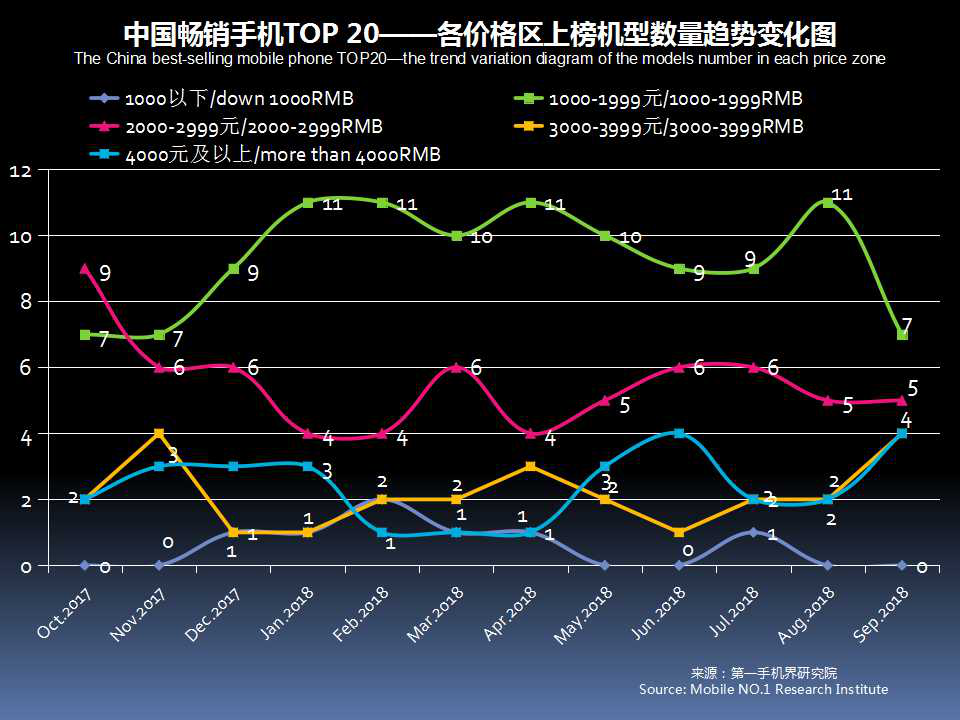 9月中国畅销手机TOP 20,超过2000元售价的机型占13款;1500-1999元价格段机型占3款;1000元-1499元价格段机型占4款。