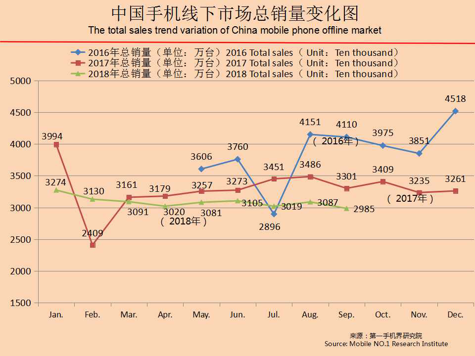 第一手机界研究院根据覆盖全国25个省/直辖市/自治区221个城市,10034家线下手机实体店的销售数据统计结果计算,2018年9月中国大陆整体手机线下市场共完成销量2985万台,环比下滑3.3%,同比下滑9.6%。