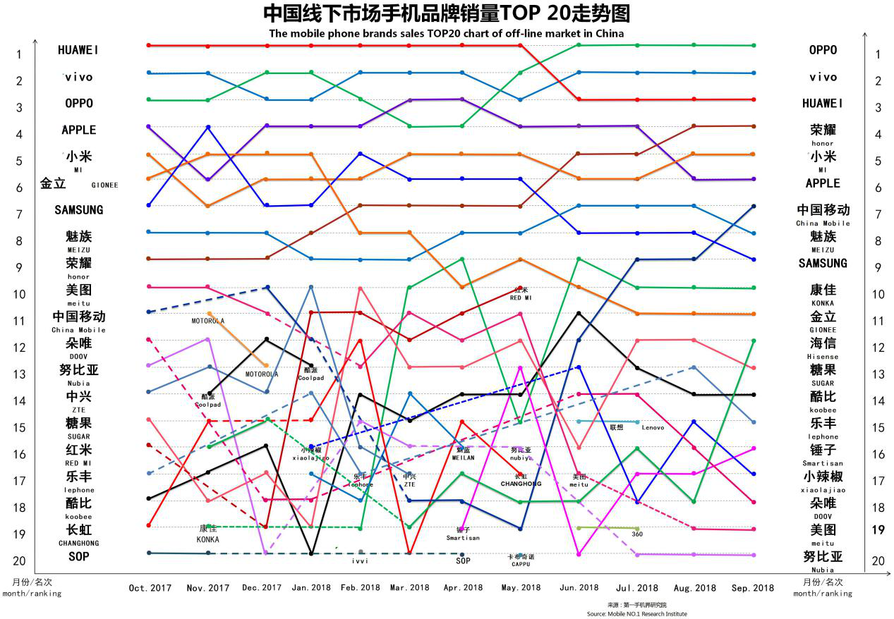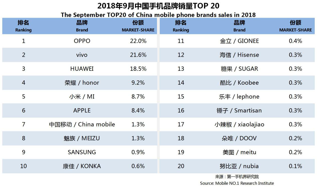 2018年9月中国手机品牌销量TOP 20