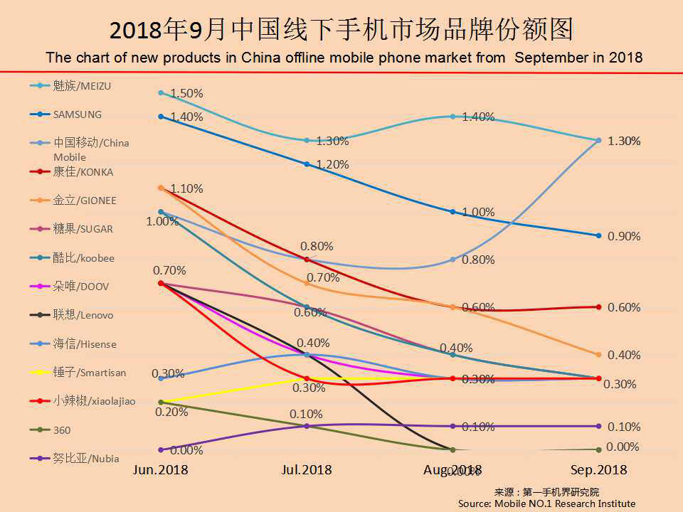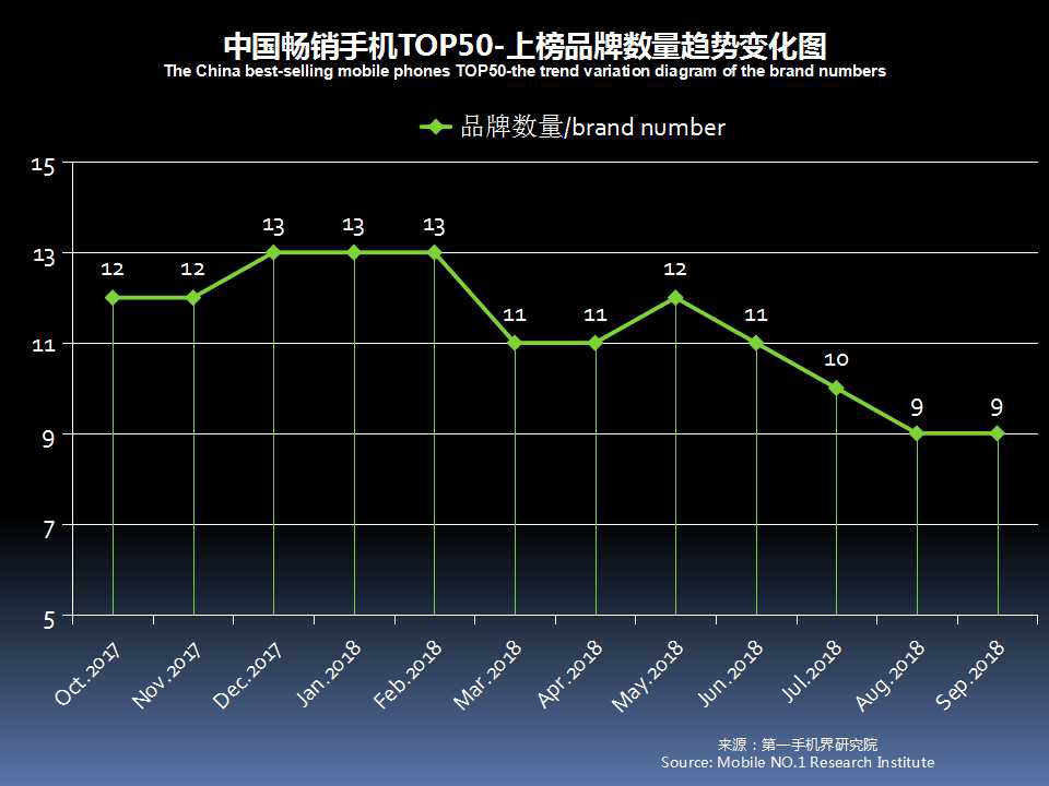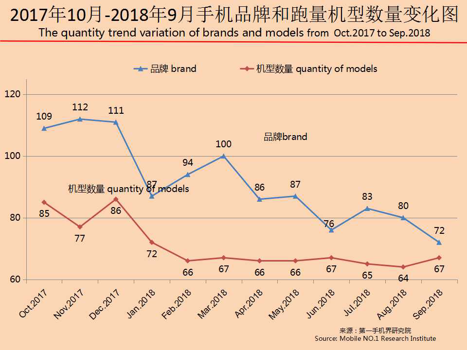 2018年9月在中国线下渠道销售的手机品牌达到72个,环比减少8个;2018年9月有一定销量的手机机型达到67款。