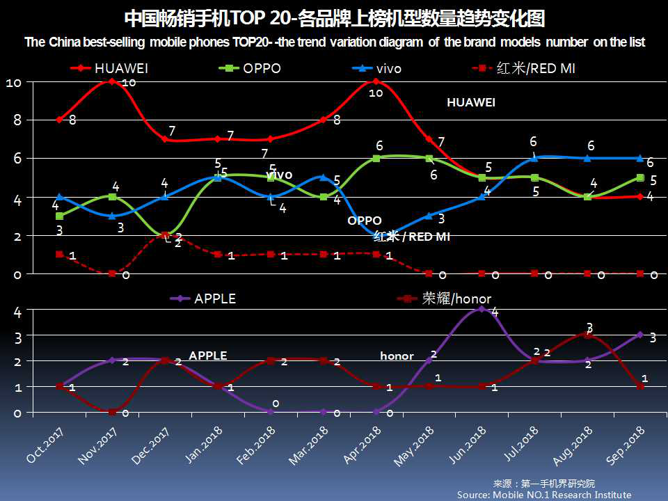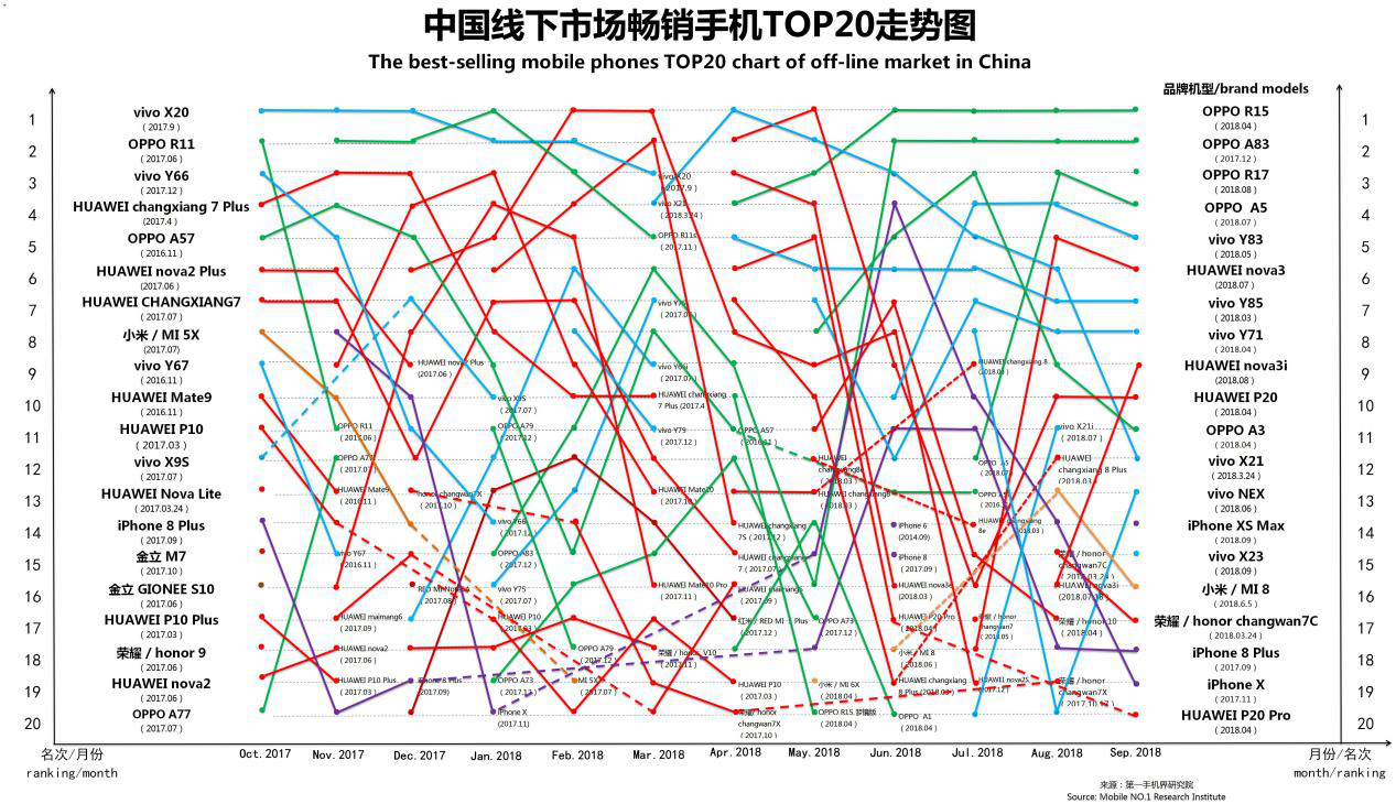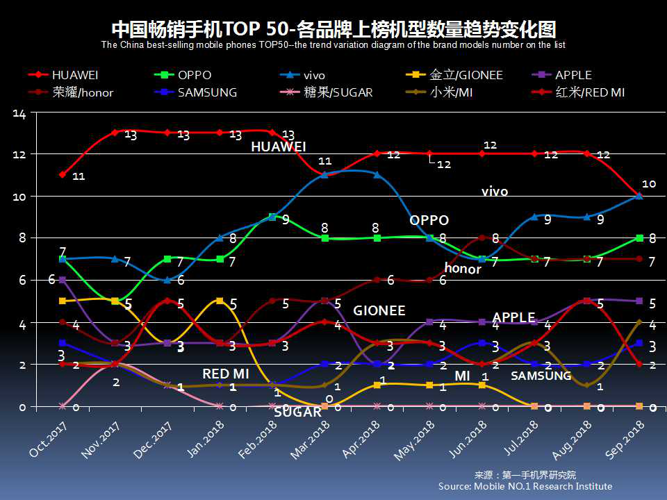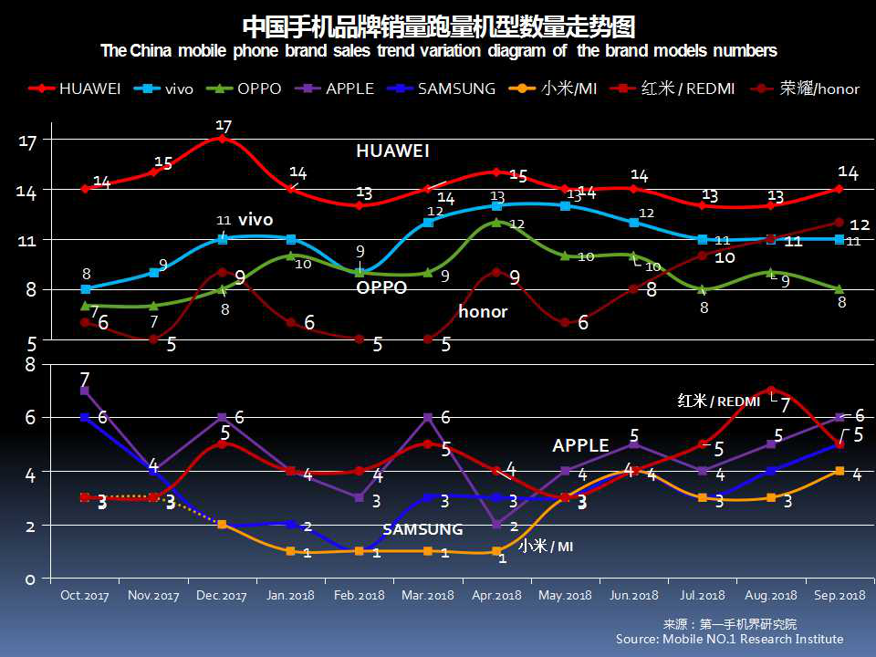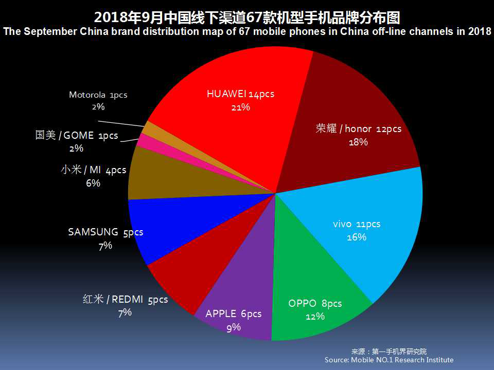 2018年9月在中国大陆线下渠道走量的手机机型基本分布是:华为14款、荣耀12款、vivo11款、OPPO8款、苹果6款、红米5款、三星5款、小米4款;国美和摩托罗拉各1款。
