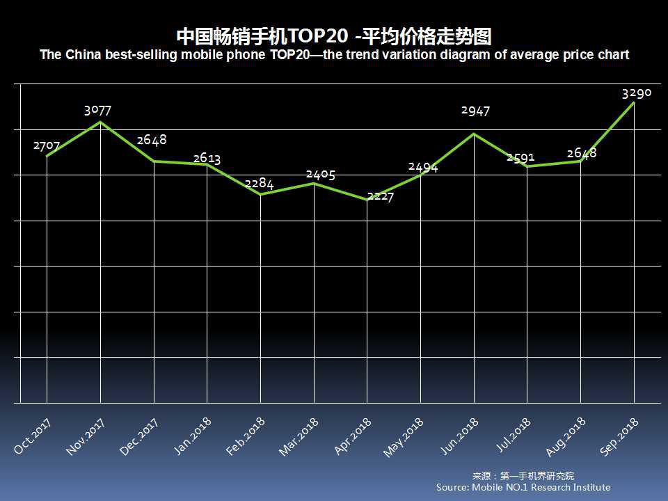20款畅销手机平均价格在3290元,环比8月2648元增长了24.3%。