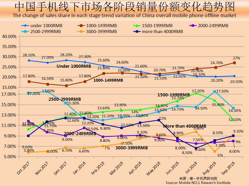 从中国手机线下市场各价格段销量份额变化趋势图可以看出,3000-3999元价格段销量份额骤然提升,主要是因为OPPO R17和vivo X23的热销所致。