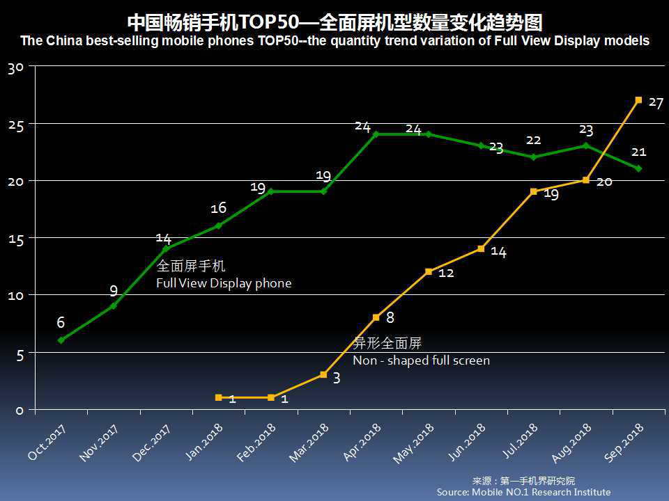 9月中国畅销手机TOP 50的全面屏手机上升至48款,环比8月增长5款。其中异形全面屏占27款,环比上月增加了7款。