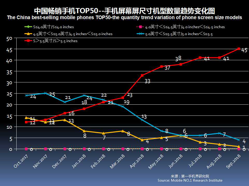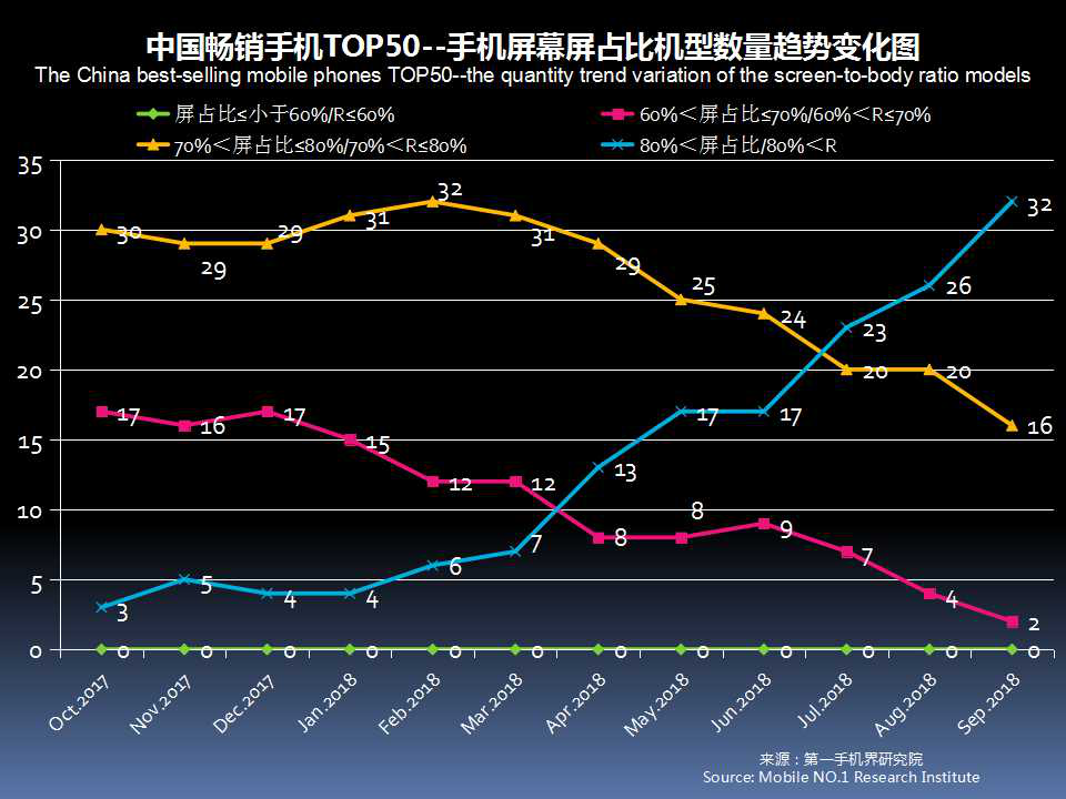 由于全面屏手机快速增加,9月中国畅销手机TOP 50的手机屏幕绝大部分超过5.5英寸,占比达90%。手机屏幕屏占比在80%以上,有26款。