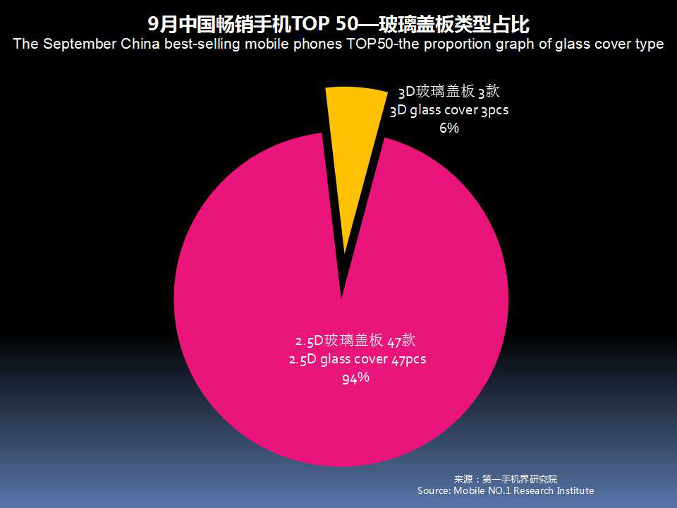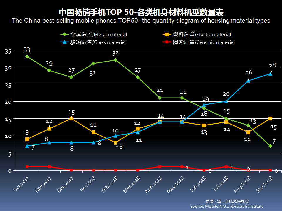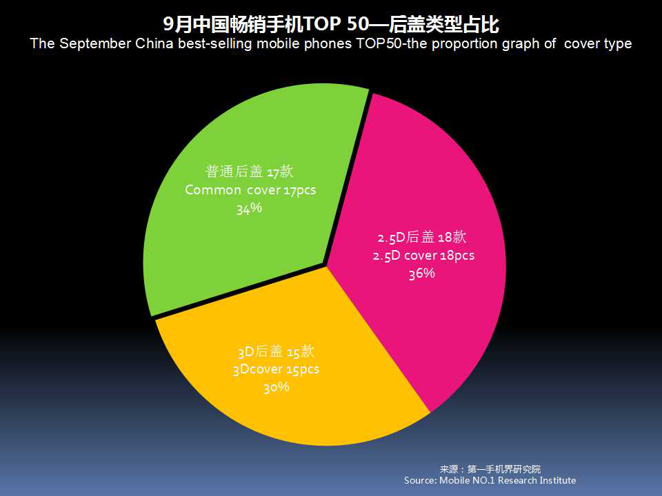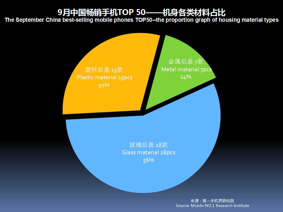 9月中国畅销手机TOP 50,采用金属后盖有7款,占比14%;玻璃后盖上升至28款占比56%,塑料后盖有15款。