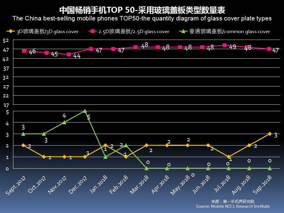 2018年9月中国畅销手机TOP 50中,采用3D玻璃盖板的手机只有OPPO Find X、三星Galaxy Note9和三星 Galaxy S9进入TOP 50。