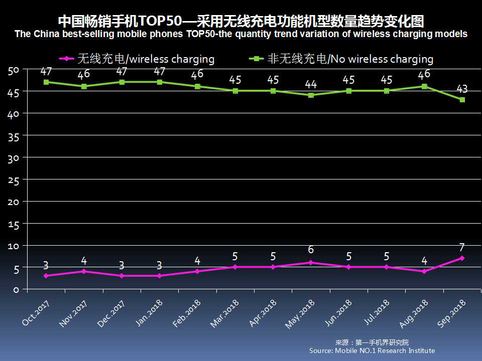 9月中国畅销手机TOP 50中,采用无线充电的机型上升至7款,占比14%,就是iPhone XS MAX、iPhone 8 Plus、iPhone X、iPhone 8、iPhone XS、三星 Galaxy Note9、三星 Galaxy S9。