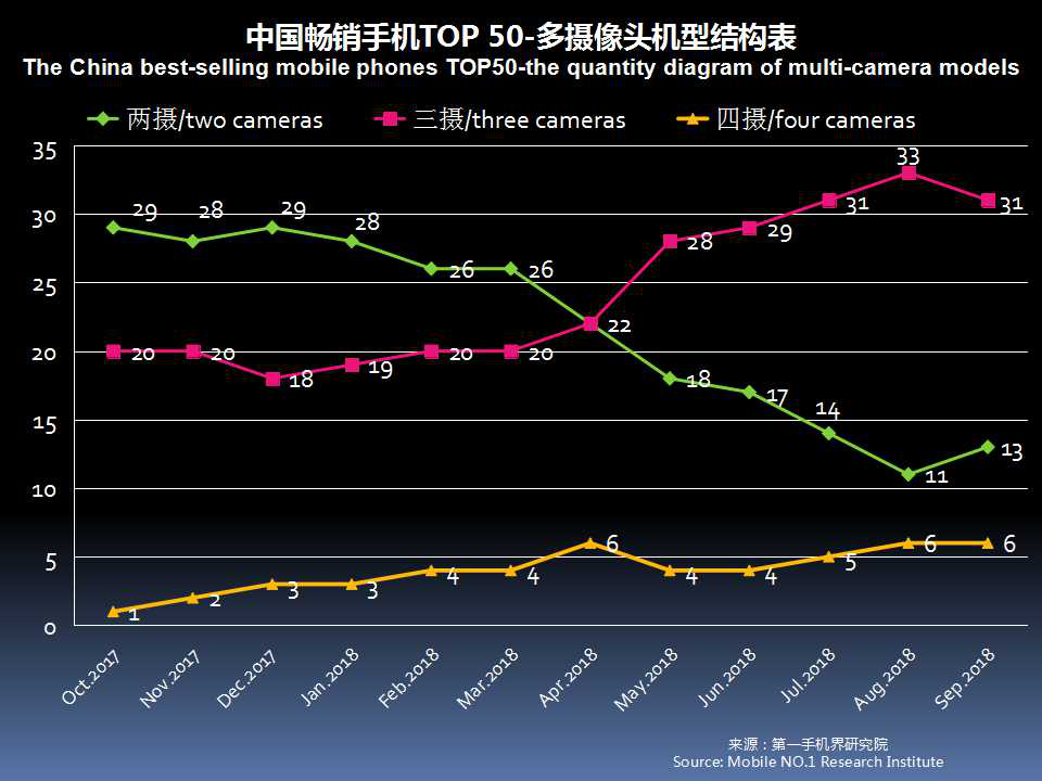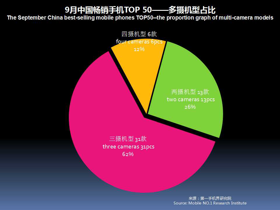 9月中国畅销手机TOP 50中,已有37款机型采用多摄像头设计,占比74%。