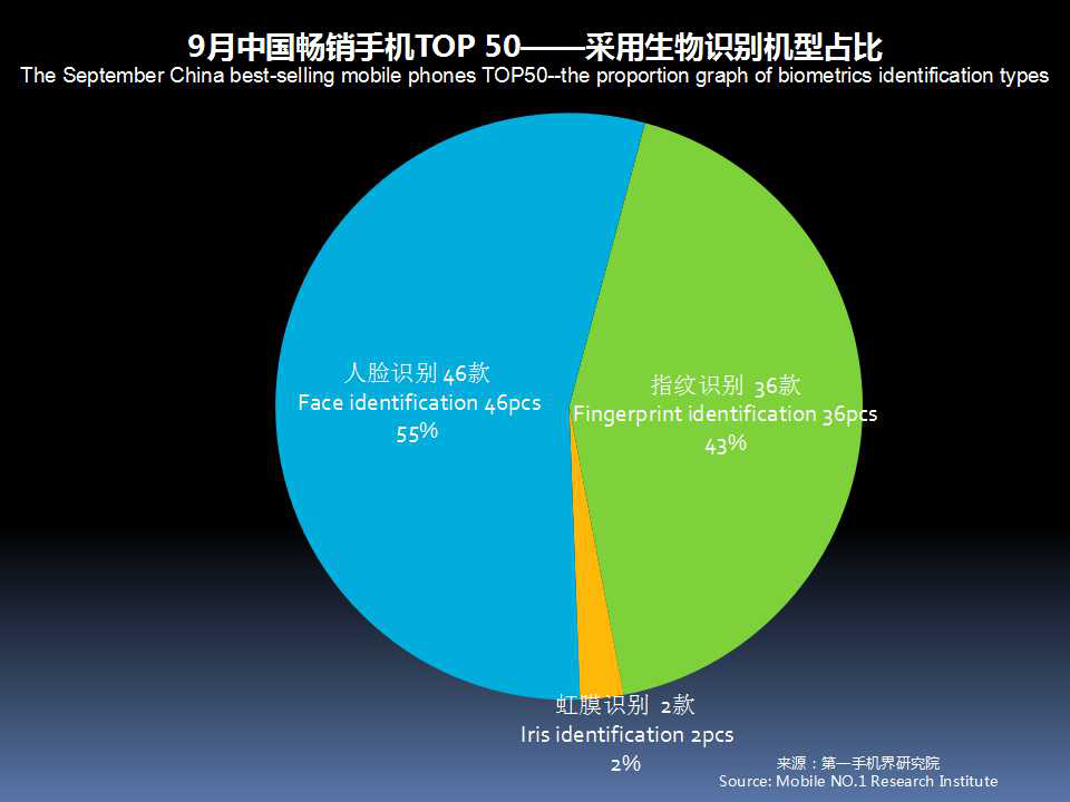 9月中国畅销手机TOP 50,采用指纹识别功能的手机有36款,占比43%;采用虹膜识别有2款,占比2%;采用人脸识别有46款,占比55%。