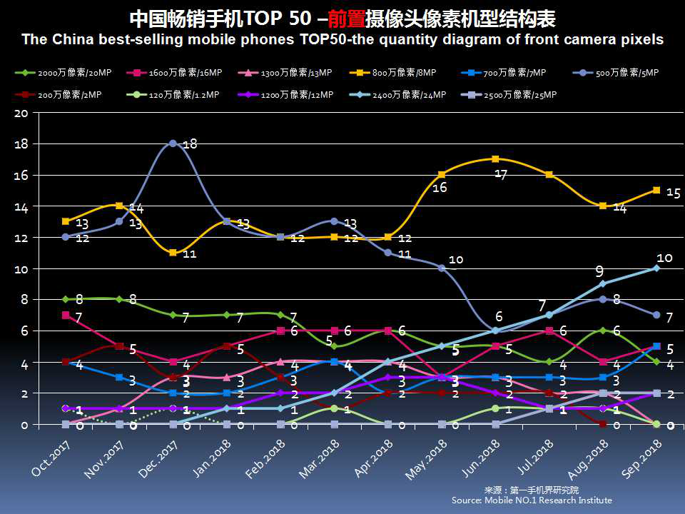 9月中国畅销手机TOP 50中,前置摄像头2400万像素的有10款,占比20%;采用2000万像素的有4款,占比8%;采用1600万像素有5款,占比10%。