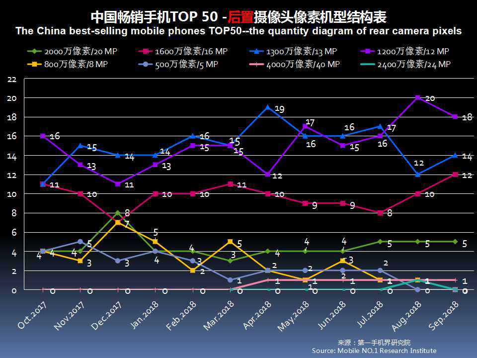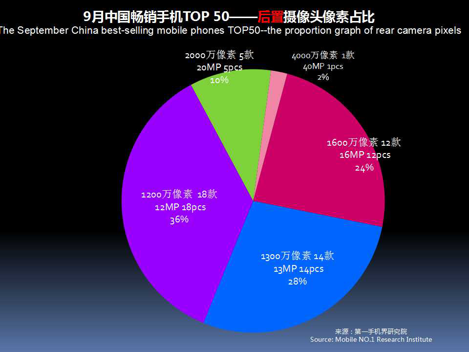 9月畅销手机TOP 50中,后置摄像头采用4000万像素的有1款;采用2000万像素的有5款,占比10%;采用1600万像素的有12款,占比24%。