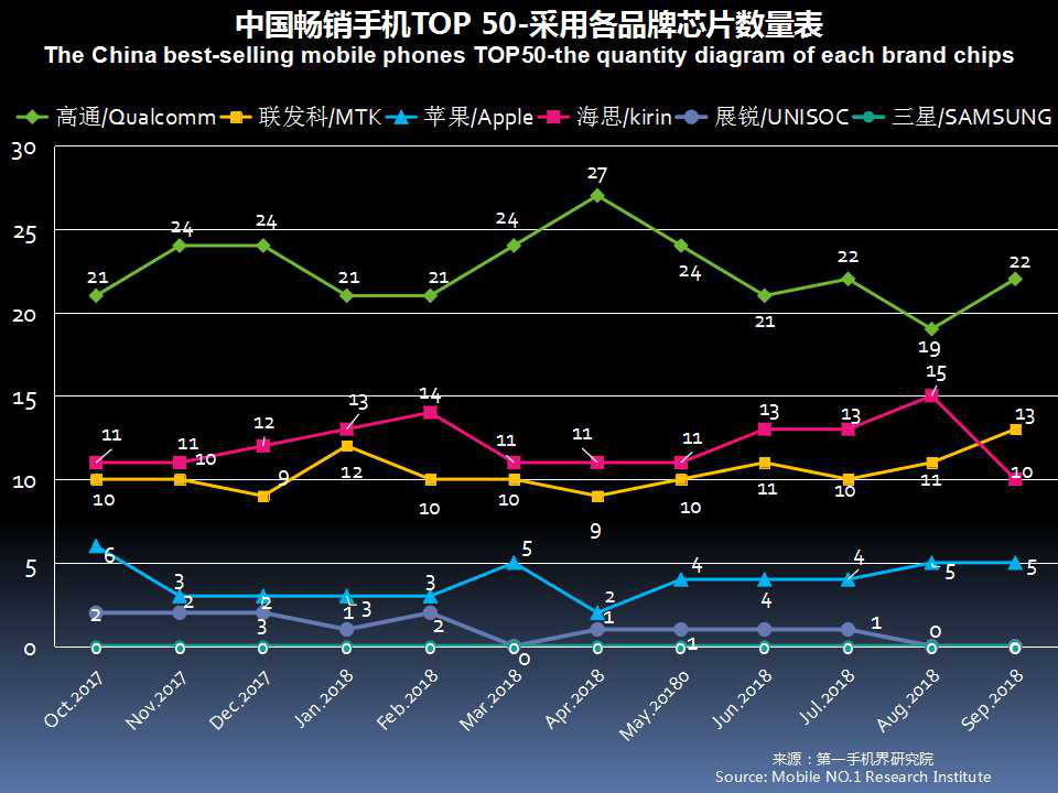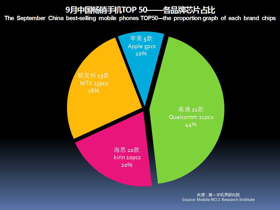 9月中国畅销手机TOP 50中,采用高通芯片的有22款,联发科(MTK)13款,海思10款,苹果5款。高通芯片占有率达44%。