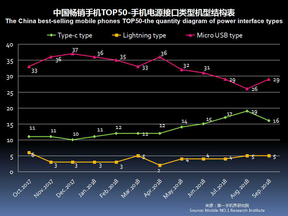 9月中国畅销手机TOP 50中,采用Type-c接口的机型有16款。