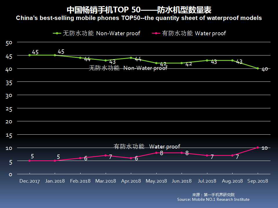 2018年9月畅销手机TOP 50中,具有防水功能的机型有10款,分别是华为 P20、iPhone XS MAX、iPhone 8 Plus、iPhone X、华为 P20 Pro、iPhone 8、iPhone XS、华为 Mate10 Pro、三星 Galaxy Note9、三星 Galaxy S9。
