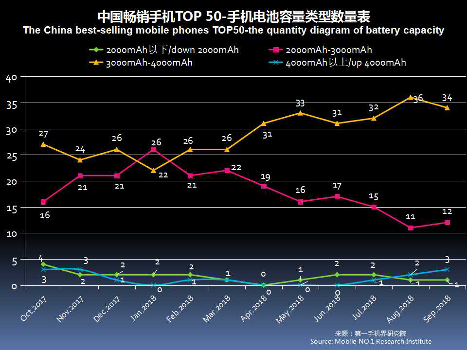 续航能力已经成为手机卖点之一,9月中国畅销手机TOP 50中,电池容量3000mAh-4000mAh的机型数量有34款,4000mAh以上的机型有3款,就是OPPO A5、荣耀 8X Max、摩托罗拉 E5 Plus。