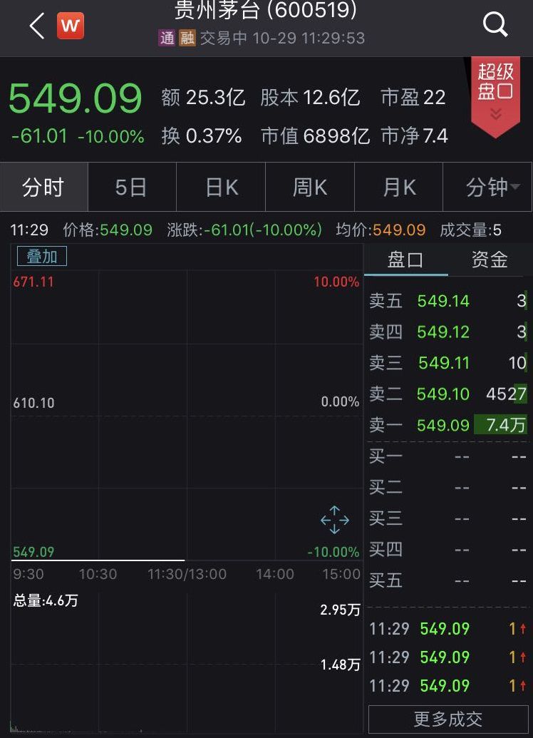 今日,受三季度业绩不及预期影响,贵州茅台开盘跌停,股价创一年新低,跌破600元大关,报549.09元/股。