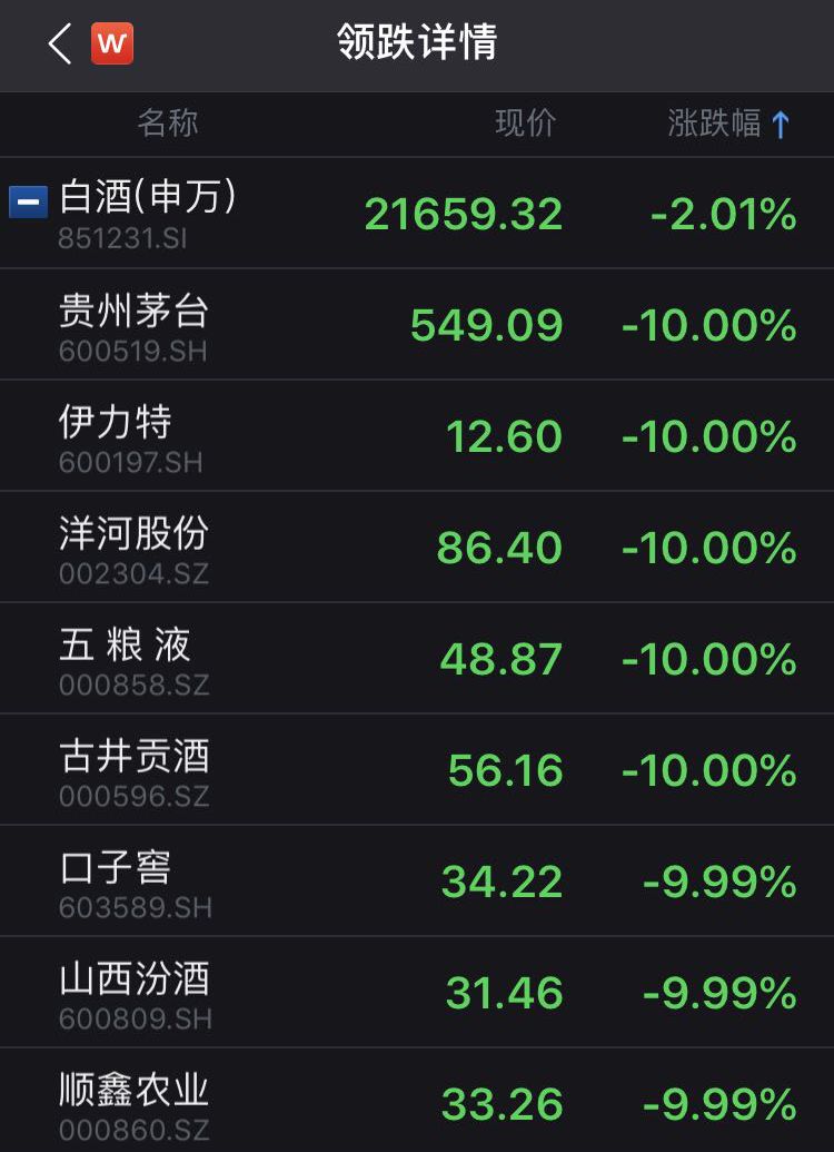 今日(10月29日),贵州茅台跌停,白酒股集体暴跌。