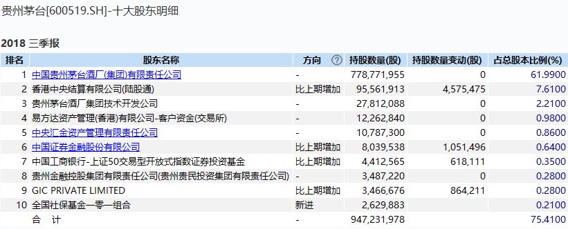 据WIND数据,截至三季度末,贵州茅台前十大股东中陆股通、证金公司和GIC PRIVATE LIMITED(新加坡政府投资公司)分别较之前增持了股份。