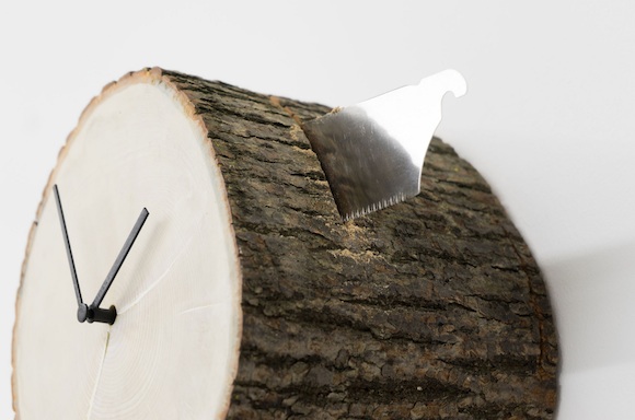 “它叫作时间杀手(Time Killer),”陶海悦指着那个被锯子按照秒针频率来回锯割的木桩说,“半年到一年,这个木桩就会被锯断,那么这段时间就结束了,这个钟也就报废了。”