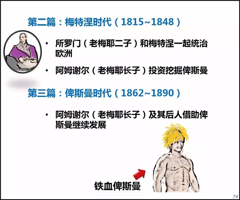 老梅耶之后,罗斯柴尔德家族的老三立足英国,老五控制法国,老二控制欧洲,老大则投资了德国未来的铁血人物俾斯麦,老四搭上了天主教皇,在意大利如鱼得水,五兄弟各显神通。