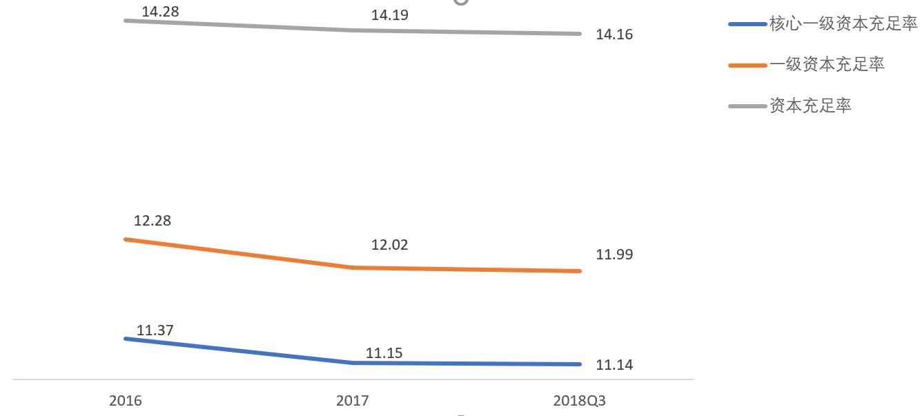 在资本充足率方面,截至今年9月末,该行核心一级资本充足率、一级资本充足率、资本充足率分别为11.14%、11.99%和14.16%,较上年末分别下降了0.01%、0.03%和0.03%。