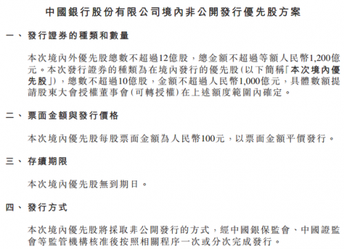 10月29日,中国银行发布公告,董事会会议通过了境内外非公开发行优先股方案。方案称拟在境内外非公开发行总数不超过12亿股优先股,总金额不超过1200亿元。其中,在境内市场发行不超过人民币1000亿元优先股,在境外市场发行不超过等额人民币400亿元优先股。