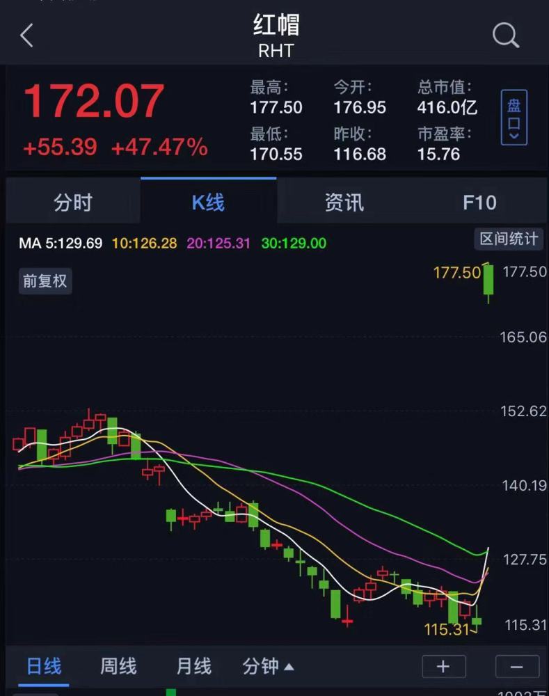 截至记者发稿时,IBM开盘前跌6%,现在已经收窄至不到2%;红帽开盘前大涨,现在涨幅微缩至47%