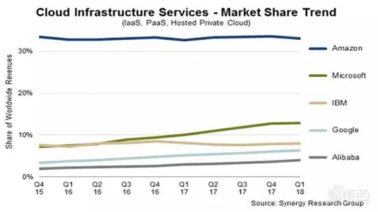 根据Synergy Research Group的数据,在云基础设施市场上,位列IBM之后的谷歌云、阿里云,其占比也不断加强,唯独IBM发力最弱。