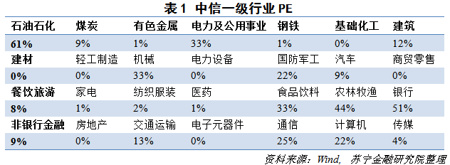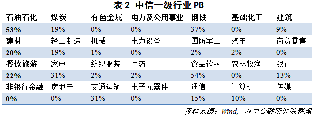 中信一级行业PB:食品饮料、石油石化、钢铁行业PB水平相对较高,分别超过历史54%、53%、37%。约36%的中信一级行业PB水平处于历史底部,超过一半的中信一级行业PB水平位于历史3%以下(见表2)。