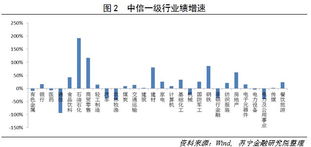 中信一级行业净利润:以已出净利润预告企业为统计对象,并以平均净利润为基础测算净利润同比增速,发现约七成企业净利润较去年有所增长,石油石化、商贸零售、钢铁行业净利润同比增速居前,分别为192%、117%、86%;通信、农林牧渔、电力及公用事业行业净利润同比增速居后,净利润分别较去年同期下降约93%、44%、21%(见图2)。