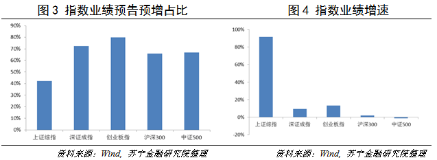 主要指数业绩情况:以目前公布的数据来看,上证综指、深证成指、创业板指、沪深300、中证500业绩预增占比分别为42%、73%、80%、66%、67%。从净利润上看,由于个别指数包含的成分股公布业绩数量较少,所以业绩差距较大。上证综指(已出三季报业绩数据的公司较少)、深证成指、创业板指、沪深300、中证500净利润同比增速分别为92%、9%、13%、2%、-1%(见图3、图4)。