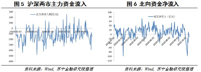 考察沪深两市今年以来每日主力资金流量,发现沪深两市主力资金在今年主要处于资金流出状态(见图5)。2018年9月以来,仅有一天资金净流入,其余时间均为资金净流出。截至2018年10月15日,主力资金流出(2018年累计)超24000亿元。