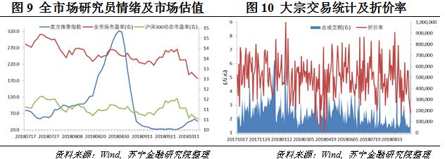 2018年8月底之前,卖方推荐指数一路上升,到高点后在9月上旬加速下降,9月中旬卖方推荐指数到达今年下半年以来低点,近期有所回升。2018年以来大宗交易额在震荡中有所萎缩,但折价率一直为正。